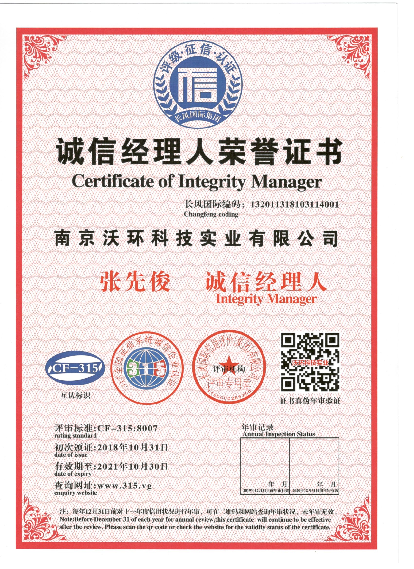 熱烈祝賀南京沃環(huán)公司張先俊先生被專業(yè)評審機構(gòu)-長風(fēng)國際集團評為誠信經(jīng)理人,特發(fā)此證書